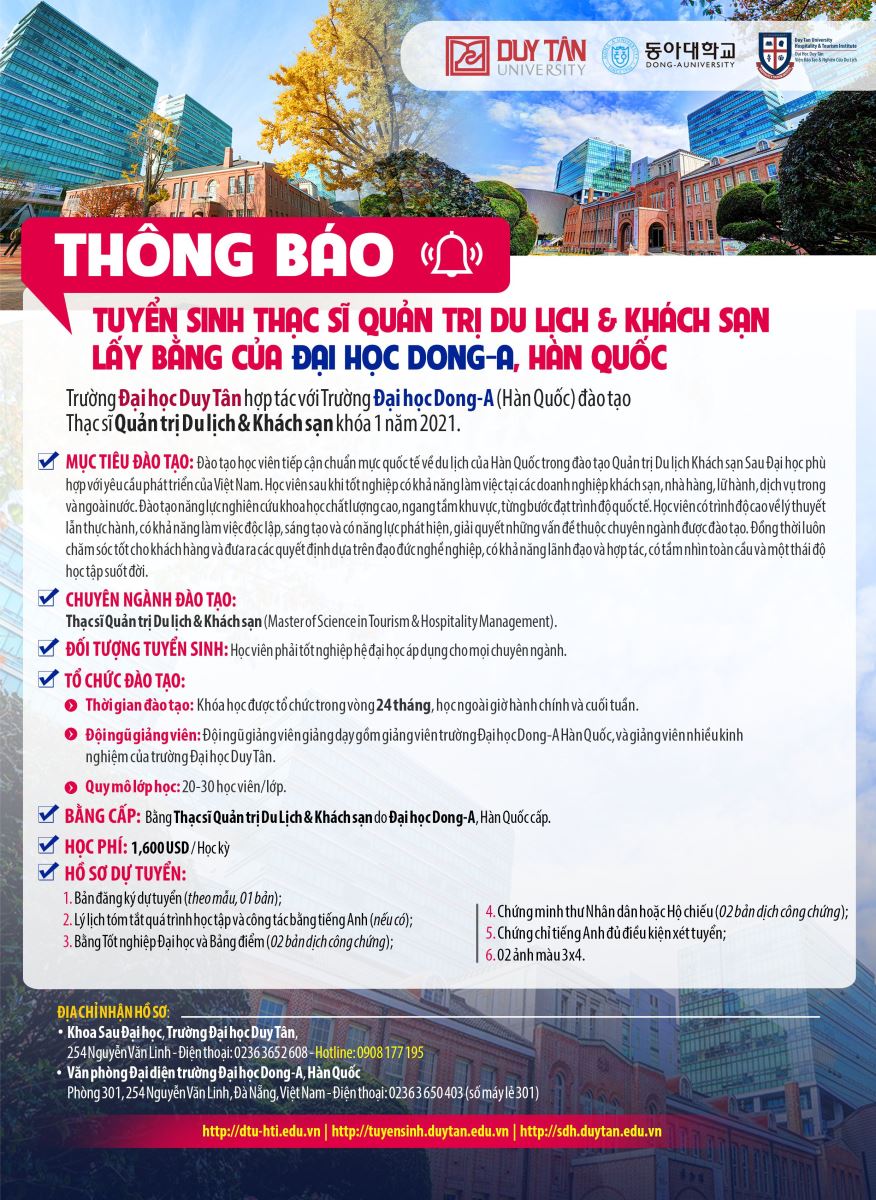 Thông báo chương trình học Thạc sỹ Quản trị Du lịch & Khách sạn lấy bằng đại học Dong-A, Hàn Quốc đợt 1 năm 2021