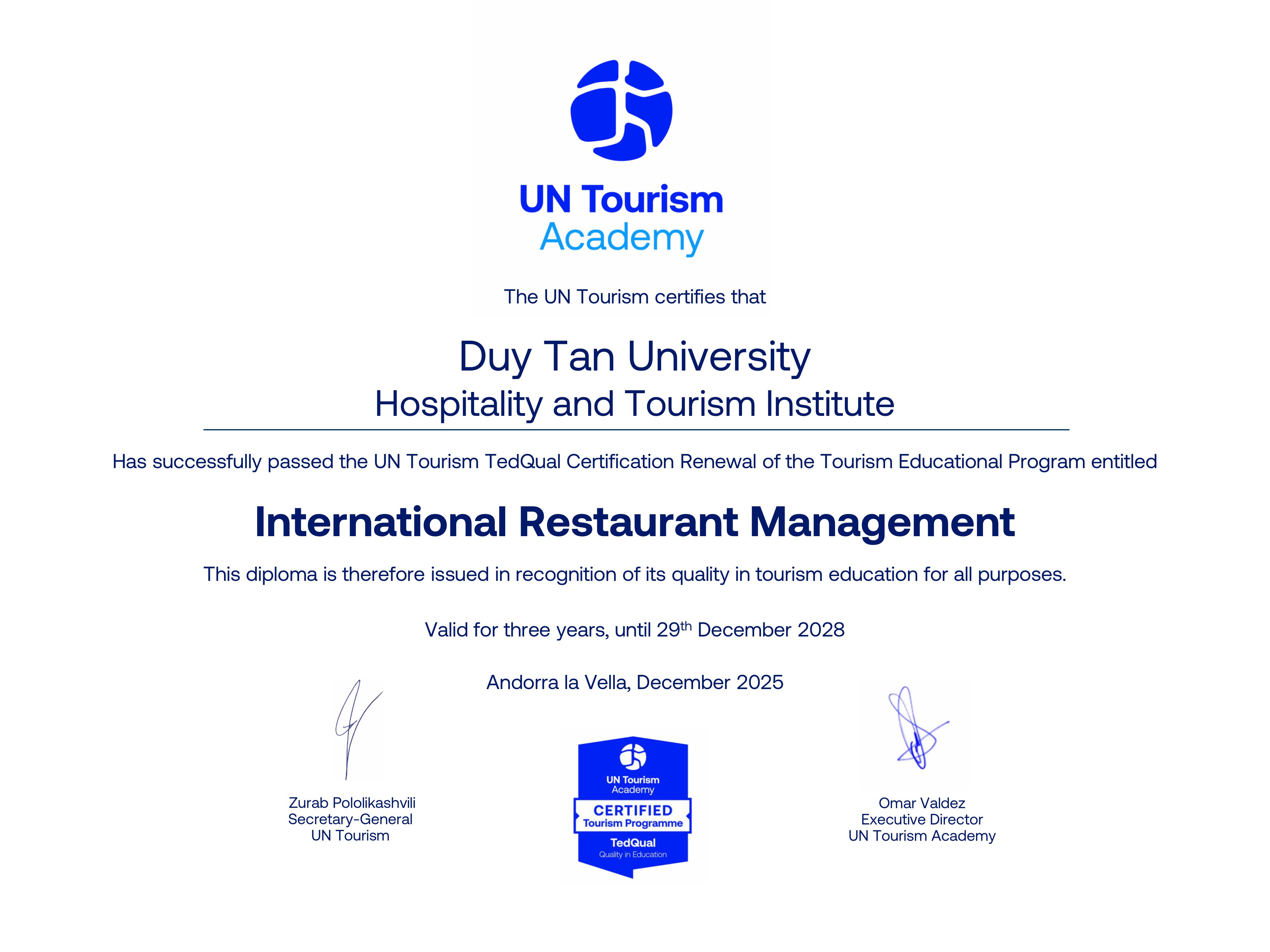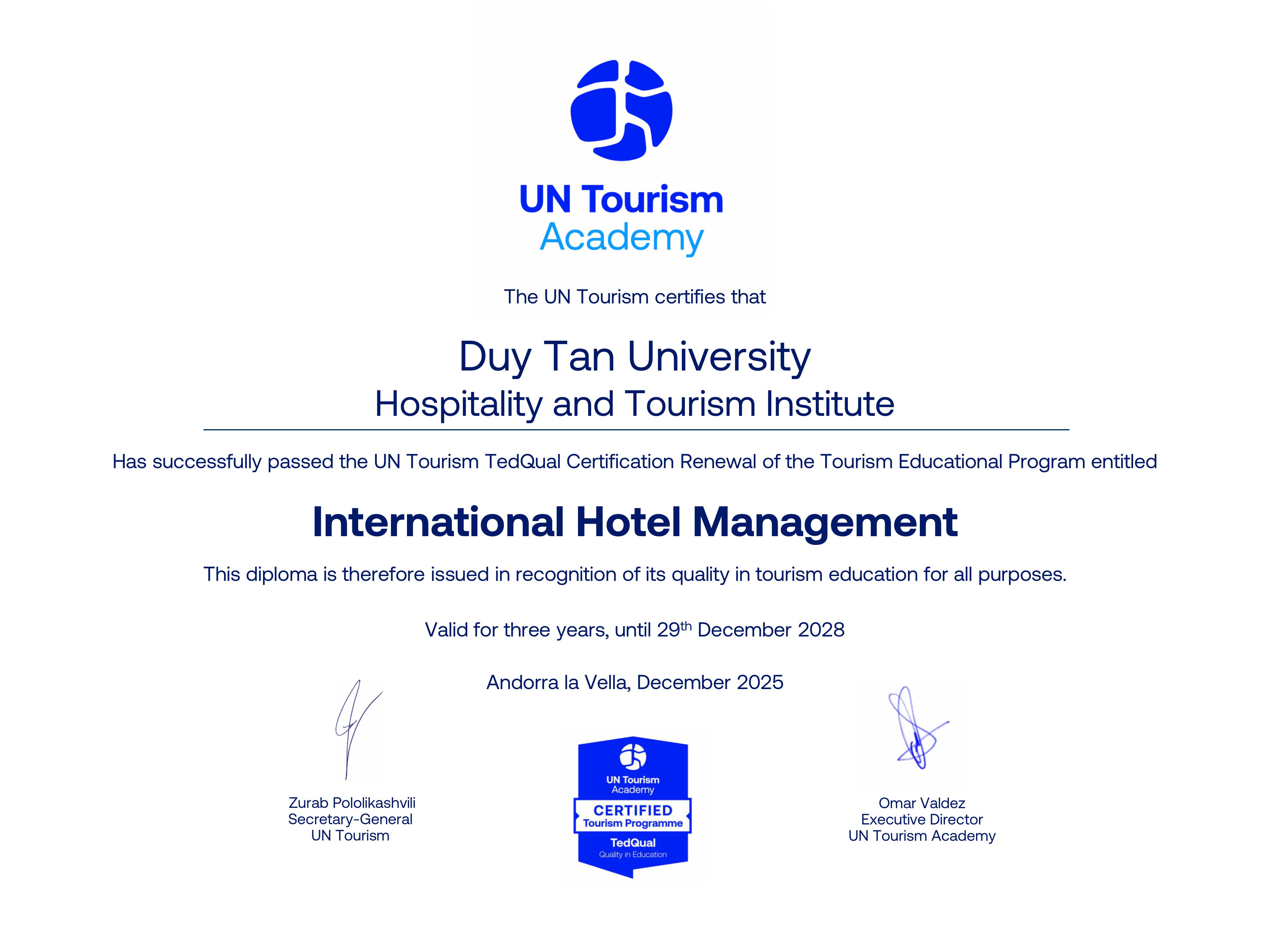 Với việc tiếp tục được UN Tourism TedQual công nhận, Trường Du lịch – Đại học Duy Tân khẳng định vai trò tiên phong trong đào tạo nguồn nhân lực du lịch – khách sạn chất lượng cao, có năng lực hội nhập và khả năng làm việc trong môi trường toàn cầu, góp phần nâng tầm vị thế giáo dục du lịch Việt Nam trên trường quốc tế.