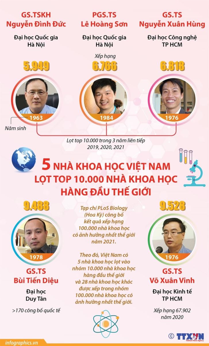 Trong 5 nhà khoa học trên, ba người lọt vào top 10.000 nhà khoa học xuất sắc nhất của thế giới trong 3 năm liên tiếp (2019, 2020, 2021) là: giáo sư, tiến sĩ Nguyễn Đình Đức; giáo sư, tiến sĩ Nguyễn Xuân Hùng và phó giáo sư, tiến sĩ Lê Hoàng Sơn.