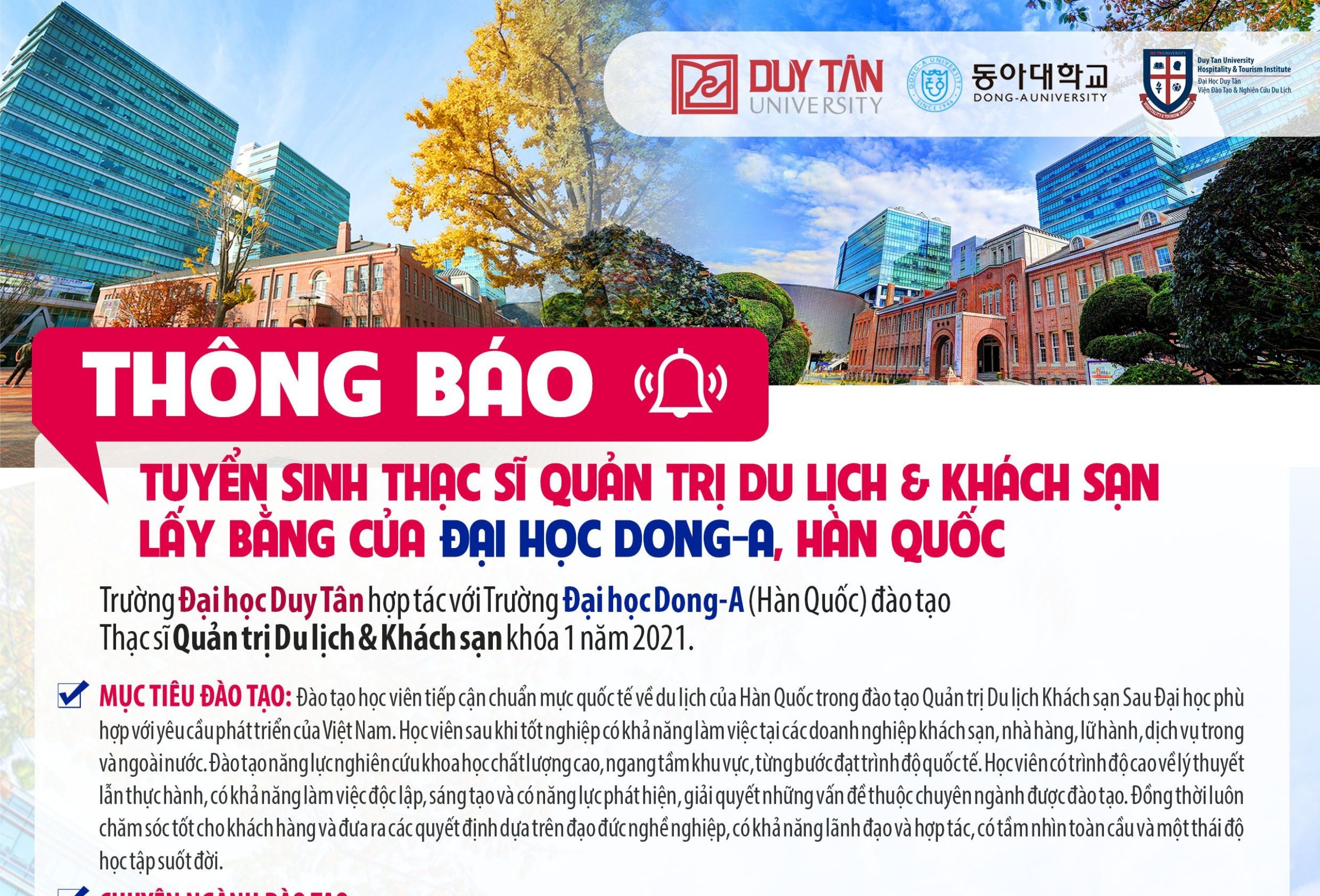 Chương trình học 24 tháng, chỉ với 8 môn học + luận văn (27 tín chỉ) do các giáo sư trường ĐH Dong-A và ĐH Duy Tân cùng giảng dạy. DAU được thành lập năm 1946 gồm 12 trường đào tạo trình độ đại học, và 7 trường đào tạo sau đại học thành viên. DAU là ...