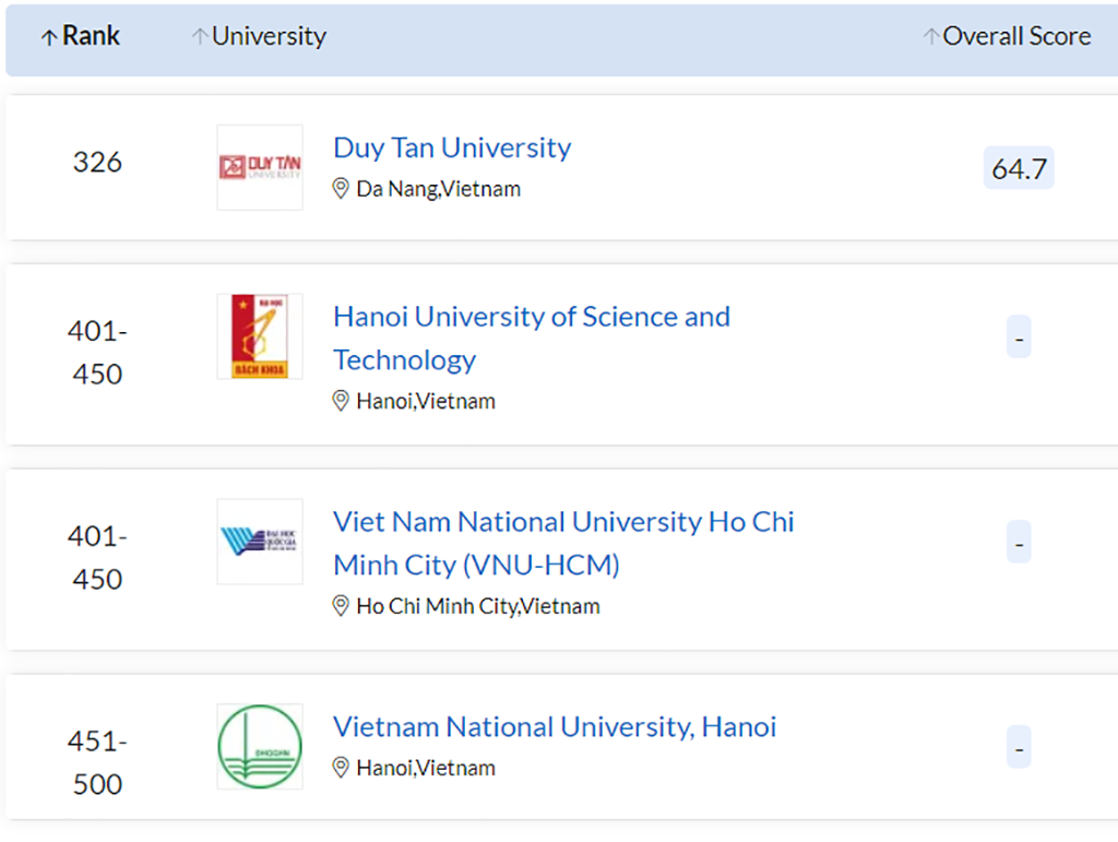 Tổ chức Quacquarelli Symonds (QS) ngày 28/6 công bố bảng xếp hạng đại học thế giới năm 2024. Việt Nam có 5 đại diện lọt vào bảng xếp hạng, đều là những tên tuổi quen thuộc: trường Đại học Duy Tân, Tôn Đức Thắng, Đại học Quốc gia TP HCM, Đại học Quốc ...