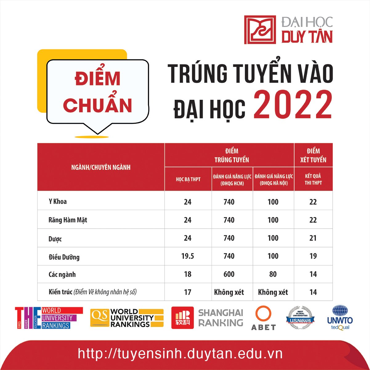 Trường Đại học Duy Tân thông báo điểm chuẩn trúng tuyển Đại học năm 2022 cho phương thức Xét tuyển theo kết quả học tập (Học bạ THPT), kết quả kỳ thi Đánh giá năng lực và điểm Xét tuyển theo kết quả thi THPT như sau: ...