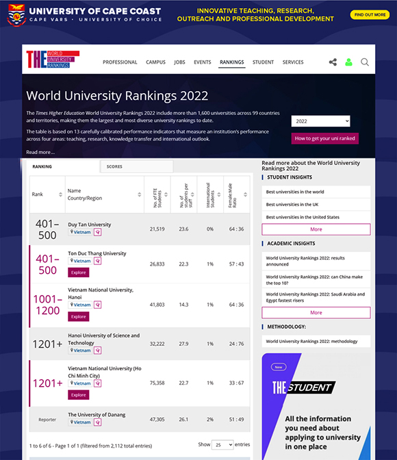 Tổ chức Times Higher Education (THE) vừa công bố bảng xếp hạng các trường đại học (ĐH) tốt nhất thế giới năm 2023. Năm nay, có 6 đại học của Việt Nam nằm trong bảng xếp hạng uy tín bậc nhất thế giới này, tăng thêm 1 trường so với năm 2022. ...