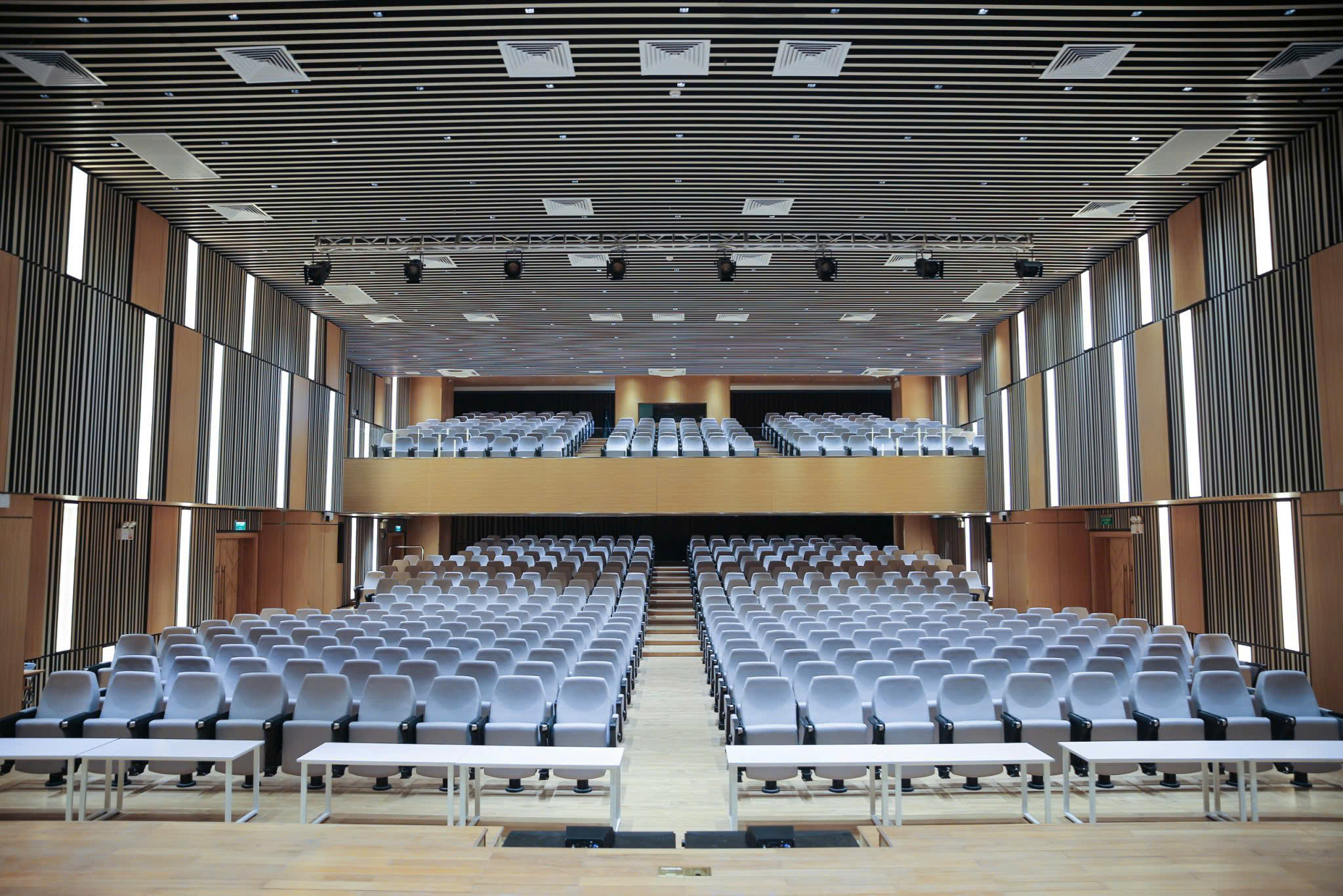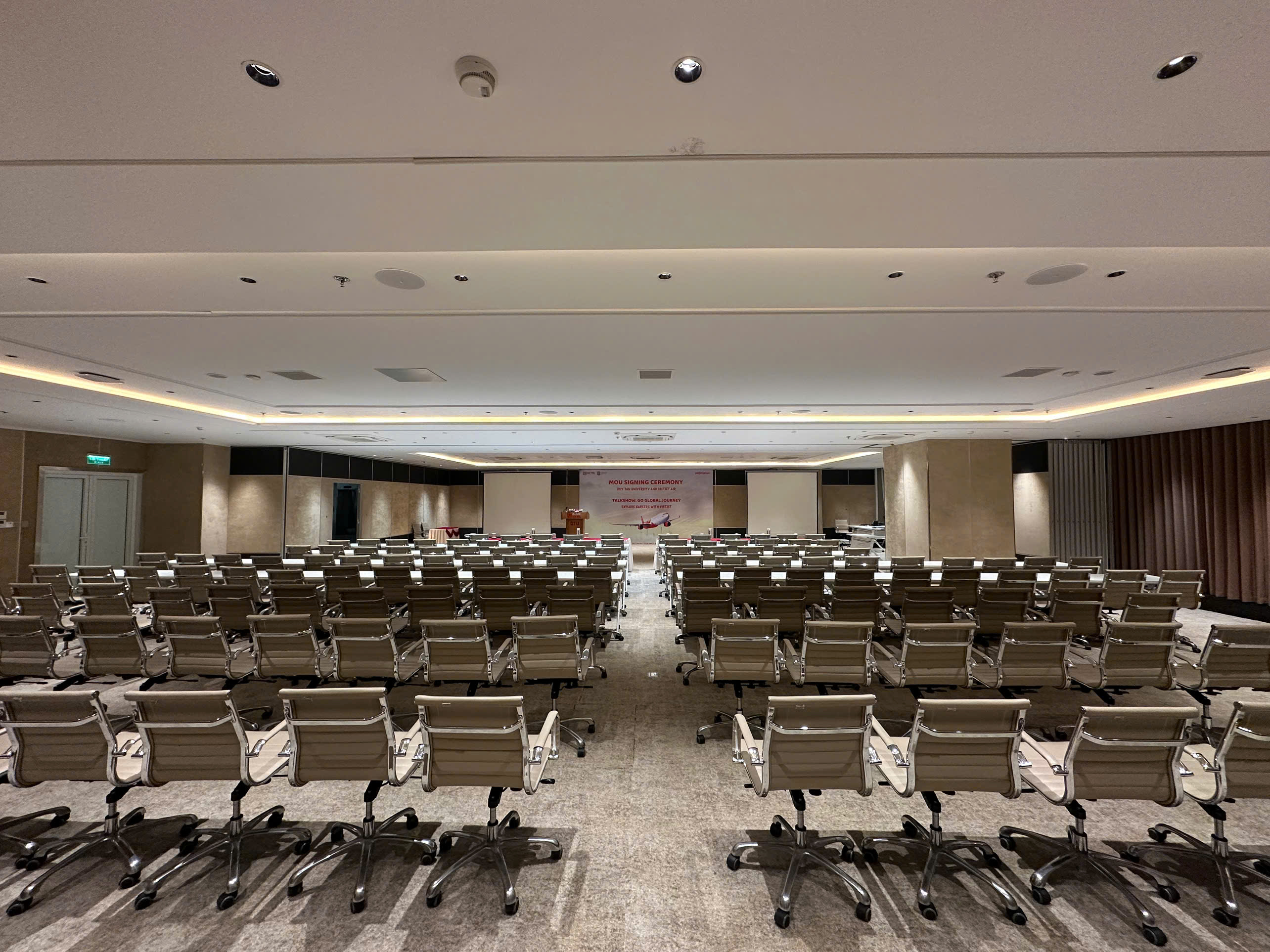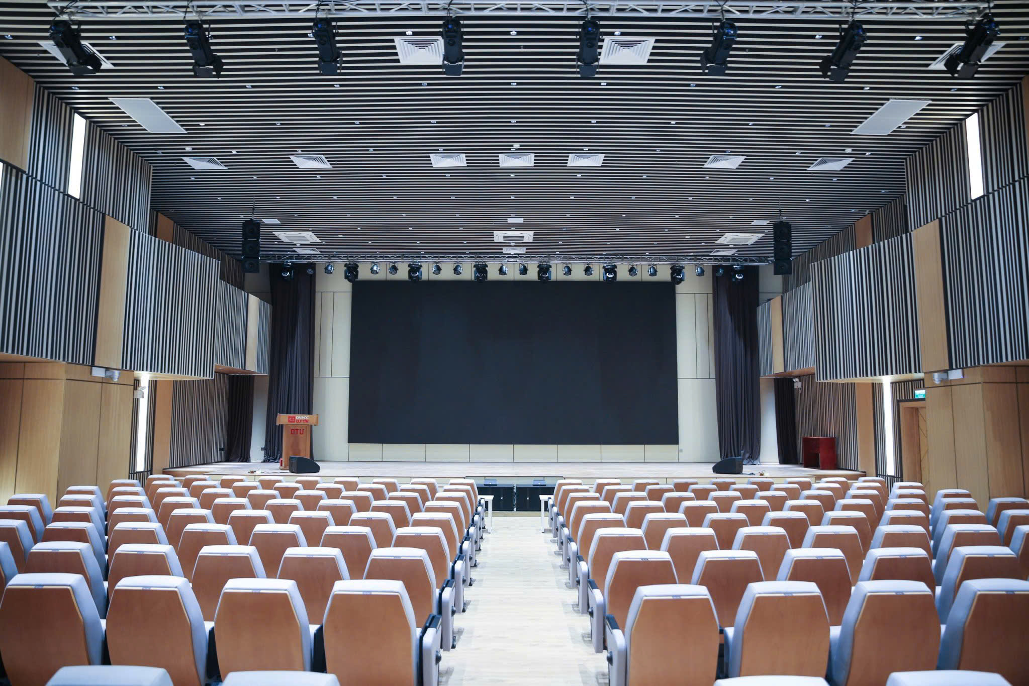 Bên cạnh đó, Trường còn sở hữu 03 phòng hội nghị đa chức năng, mỗi phòng có sức chứa hơn 150 chỗ ngồi và có thể liên thông linh hoạt tùy theo tính chất chương trình, phù hợp cho các buổi tọa đàm, workshop, training chuyên ngành hoặc sự kiện nội bộ.