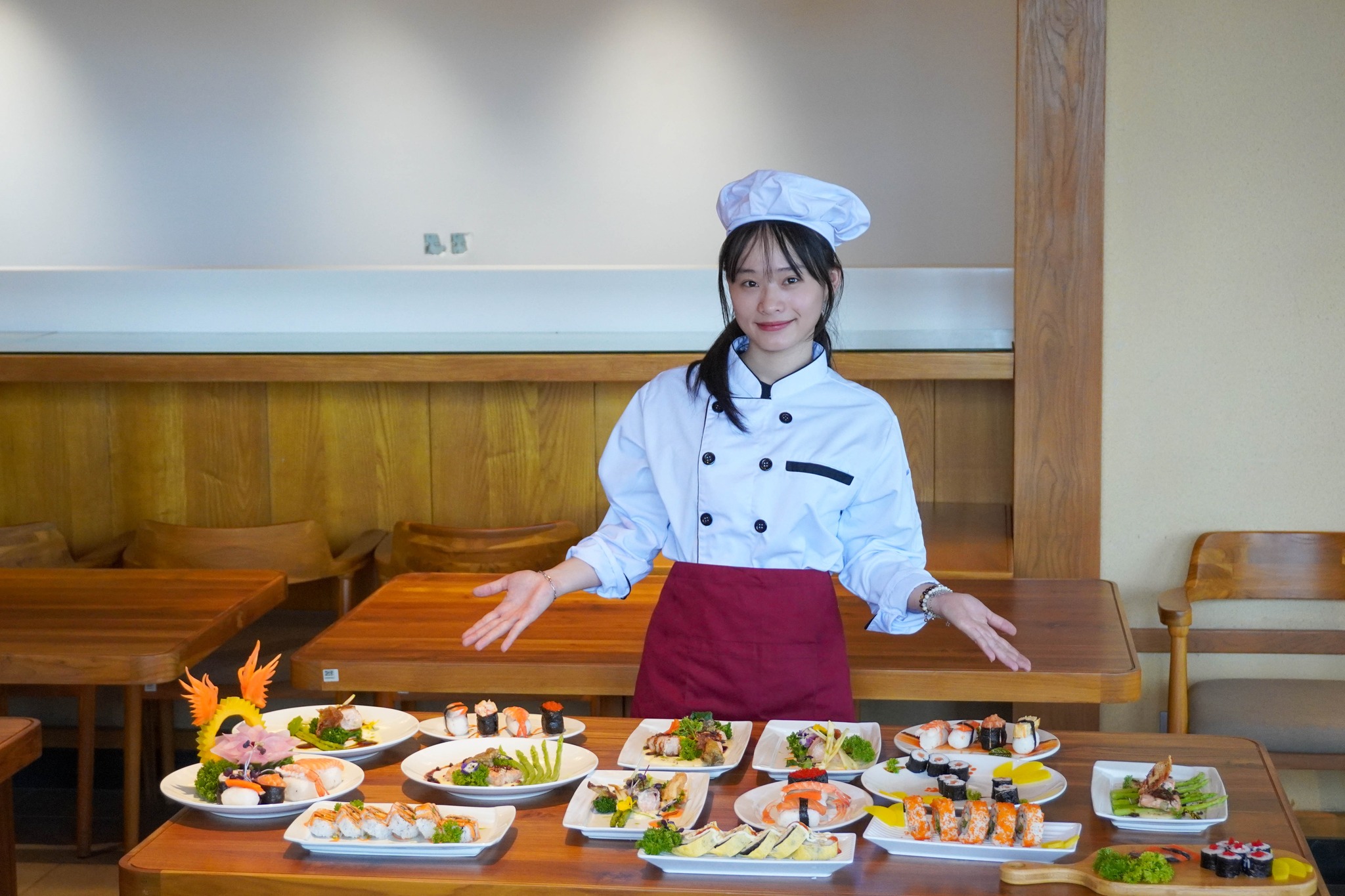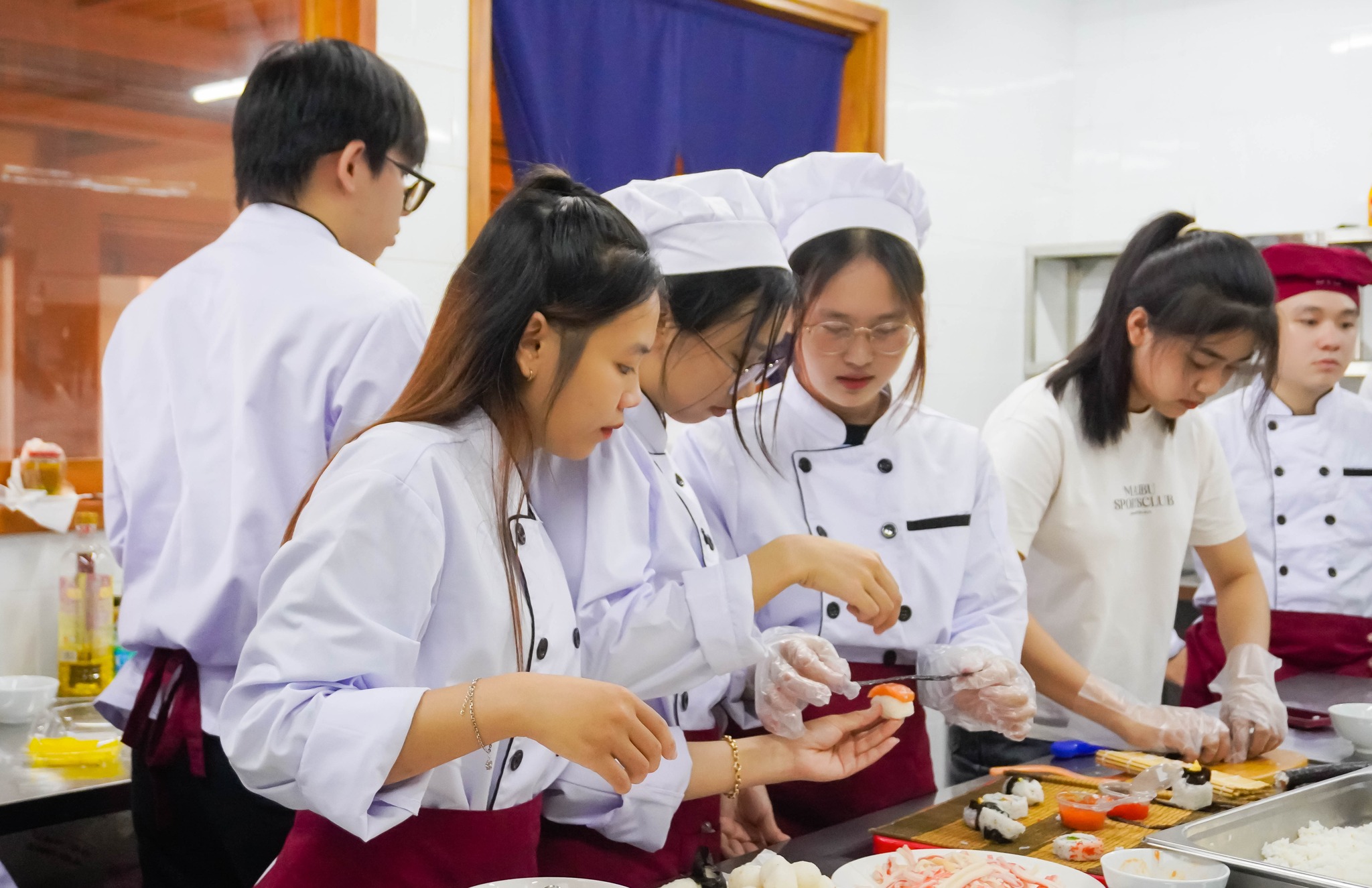 Từng thao tác cắt tỉa, từng bước chế biến sushi, sashimi, hay nghệ thuật sắp đặt món ăn… đều được sinh viên thực hiện một cách chỉn chu. Không khí lớp học sôi nổi, vừa học vừa trải nghiệm, đã mang lại nhiều kiến thức bổ ích, đồng thời khơi dậy niềm hứng thú và đam mê theo đuổi nghề bếp chuyên nghiệp trong môi trường quốc tế.