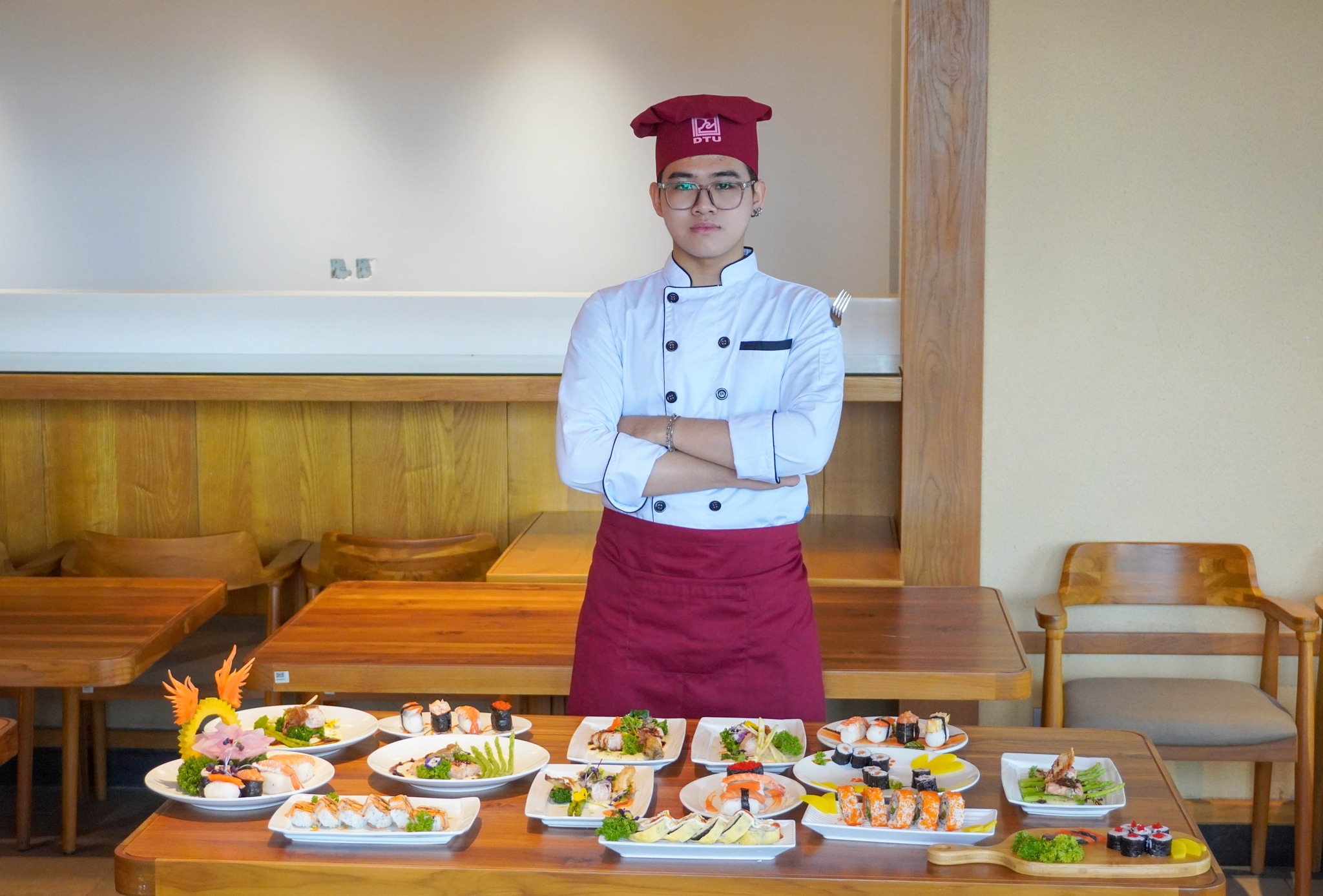 Buổi học diễn ra tại Nhà hàng Phong cách Nhật – phòng thực hành hiện đại nằm trên tầng 8, cơ sở 03 Quang Trung, trong tòa nhà Duy Tân Tower. Với không gian rộng rãi, trang thiết bị chuyên nghiệp, cùng tầm nhìn hướng ra sông Hàn và tòa nhà Quả Bắp – biểu tượng của Đà Nẵng, đây không chỉ là phòng học mà còn là “sân khấu nghề nghiệp” nơi sinh viên rèn luyện và trưởng thành.