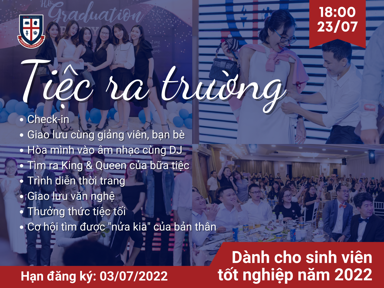 Bốn năm không quá dài cho một đời người, nhưng cũng không phải là ngắn cho những kỉ niệm. Có thể nói thời sinh viên là quãng thời gian đẹp đẽ nhất trong đời người, thanh xuân có rực rỡ hay không cũng nằm ở 4 năm giảng đường. Những ngày mộng mị về tương lai rực rỡ rồi tự mỉm cười một mình hay những lần hết tiền ăn mà cuối tháng phải ăn mì tôm, rồi lại những ngày trốn tiết đi chơi cùng bạn bè,… tất cả đã vẽ nên bức tranh thanh xuân. Và bức tranh thanh xuân đó bây giờ sắp khép lại vì một khoá sinh viên nữa lại sắp tốt nghiệp, và chắc hẳn các bạn sẽ rất nhung nhớ về khoảng thời gian học tập cũng như trải nghiệm tại ngôi trường này. Để lưu giữ lại những kỷ niệm đó cũng như enjoy cái moment trước khi ra trường, các bạn đừng quên đăng ký tham gia Tiệc ra trường dành cho sinh viên tốt nghiệp năm 2022, để cùng nhìn lại thời thanh xuân tươi đẹp và lấy thêm ý chí để quyết tâm nỗ lực hơn trong chặng đường sắp tới nhé!