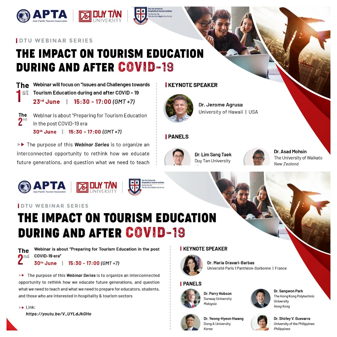 APTA (Hiệp hội Du lịch châu Á Thái Bình Dương) & DTU đồng tổ chức series Webinar này nhằm tạo ra cơ hội kết nối để cùng xem lại cách chúng ta giáo dục thế hệ tương lai, và đặt câu hỏi về những gì cần dạy và những điều cần chuẩn bị cho các nhà giáo dục, sinh viên và những người quan tâm đến lĩnh vực du lịch & dịch vụ. Diễn giả tham dự chương trình là các giáo sư đến từ ĐH Hawaii (Mỹ), ĐH Dong-A (Hàn Quốc), ĐH Waikato (New Zaeland), ĐH Sunway (Malaysia), ĐH Bách khoa Hồng Kông, ĐH Shih Hsin (Taiwan), ĐHQG Philippines, ĐH Siam (Thái Lan) và Đh Duy Tân.