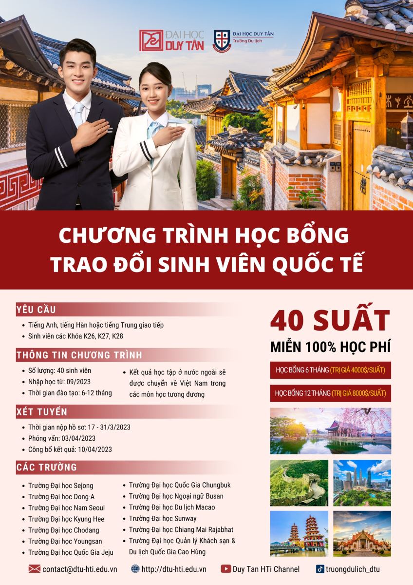 Thực hiện chương trình trao đổi sinh viên toàn cầu mỗi năm hai lần. Trường Du Lịch Đại Học Duy Tân thông báo đến sinh viên Đại học Duy Tân chương trình trao đổi sinh viên học kỳ mùa thu (9/2023) với 13 trường đại học của Hàn Quốc, Thái Lan, Macao, Đài Loan, Malaysia. Cụ thể như sau.
