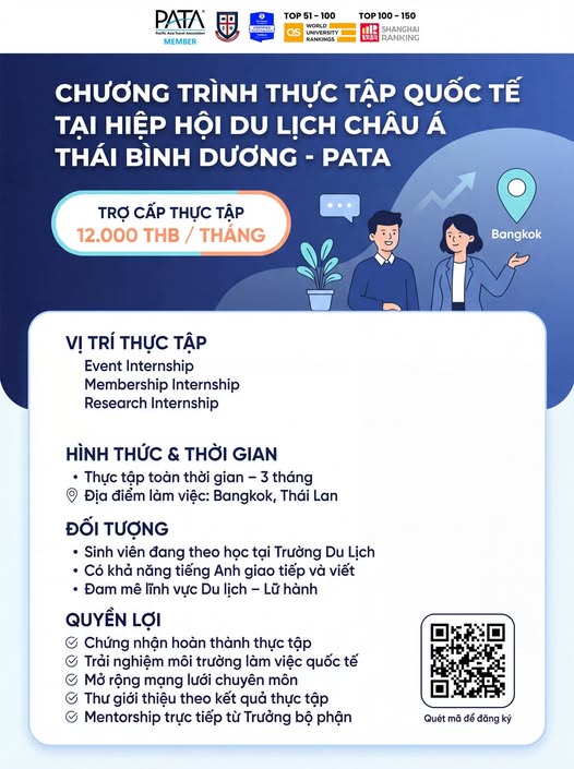 Chương trình thực tập tại PATA là kết quả từ những nỗ lực không ngừng của Nhà trường trong việc mở rộng hợp tác quốc tế, gắn đào tạo với các tổ chức nghề nghiệp uy tín toàn cầu. Thông qua chương trình, sinh viên Trường Du Lịch có thêm cơ hội tiếp cận môi trường làm việc chuyên nghiệp, nâng cao năng lực hội nhập và từng bước khẳng định bản thân trên hành trình nghề nghiệp quốc tế.