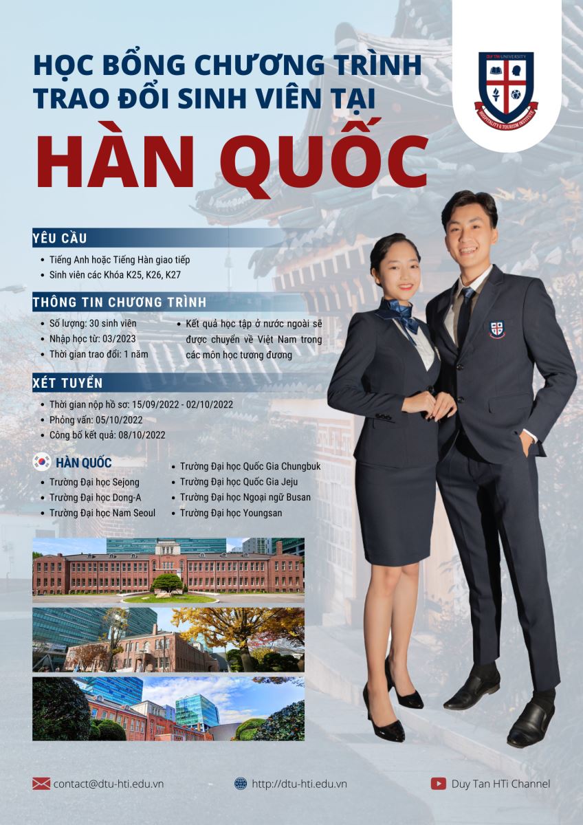Trường Du lịch thông báo chương trình học bổng trao đổi sinh viên tại Hàn Quốc học kỳ mùa xuân 2023 như sau: