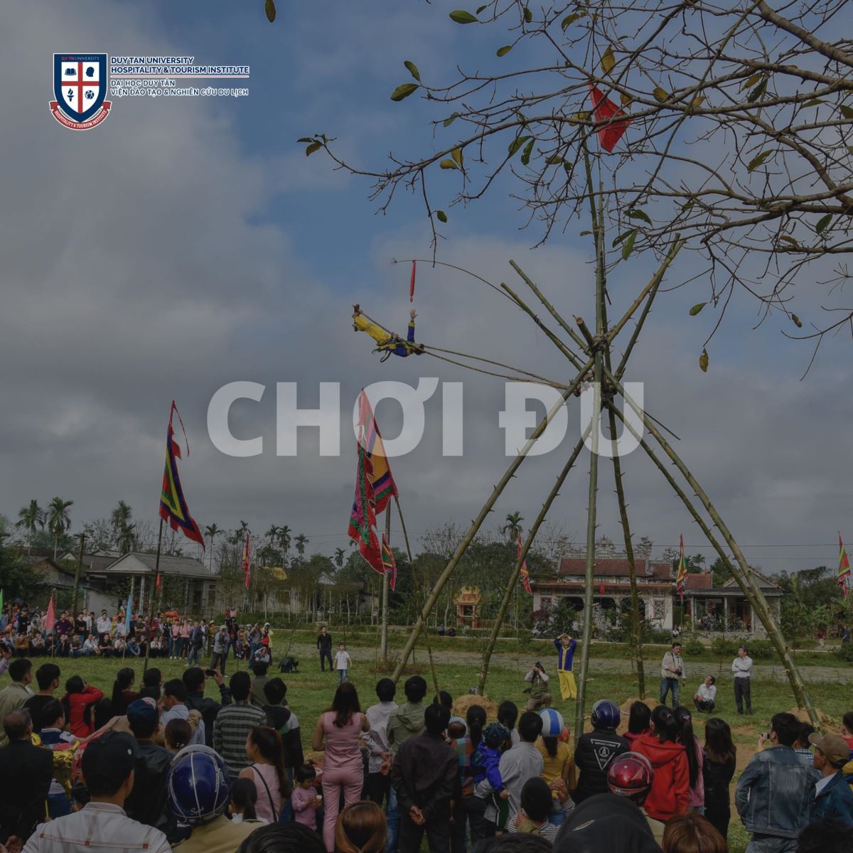 Trong những ngày Tết diễn ra, trò chơi đu được người dân vô cùng thích thú và ưa chuộng, đây là trò chơi mang tính chất giải trí cao. Trên một khoảng đất rộng, sáu hay tám cây tre dài được chôn sâu đủ vững chắc để chịu được sức nặng của hai người cùng với lực đẩy quán tính. Hai cây tre làm cần đu nhỏ, vừa tay cầm được treo ở chính giữa. Lên đu có thể là một hay hai người. Càng nhún mạnh thì đu càng lên cao từ bên nọ sang bên kia, nhiều khi đu bay ngang ngọn đu một vòng. Ở nhiều nơi, người ta còn treo phần thưởng ở ngang ngọn đu để người đu giật giải. Thời điểm này cũng là lúc các đôi trai gái thỏa sức thể hiện tài năng của mình, có khi họ còn được se duyên với nhau từ việc đu một cặp.