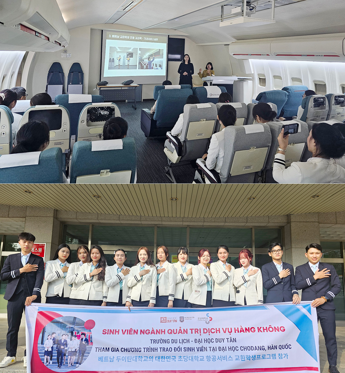 SV DTU được thực hành nghiệp vụ ngay trong khoang mô phỏng máy bay thật ở Hàn Quốc - Ảnh: ĐHDT