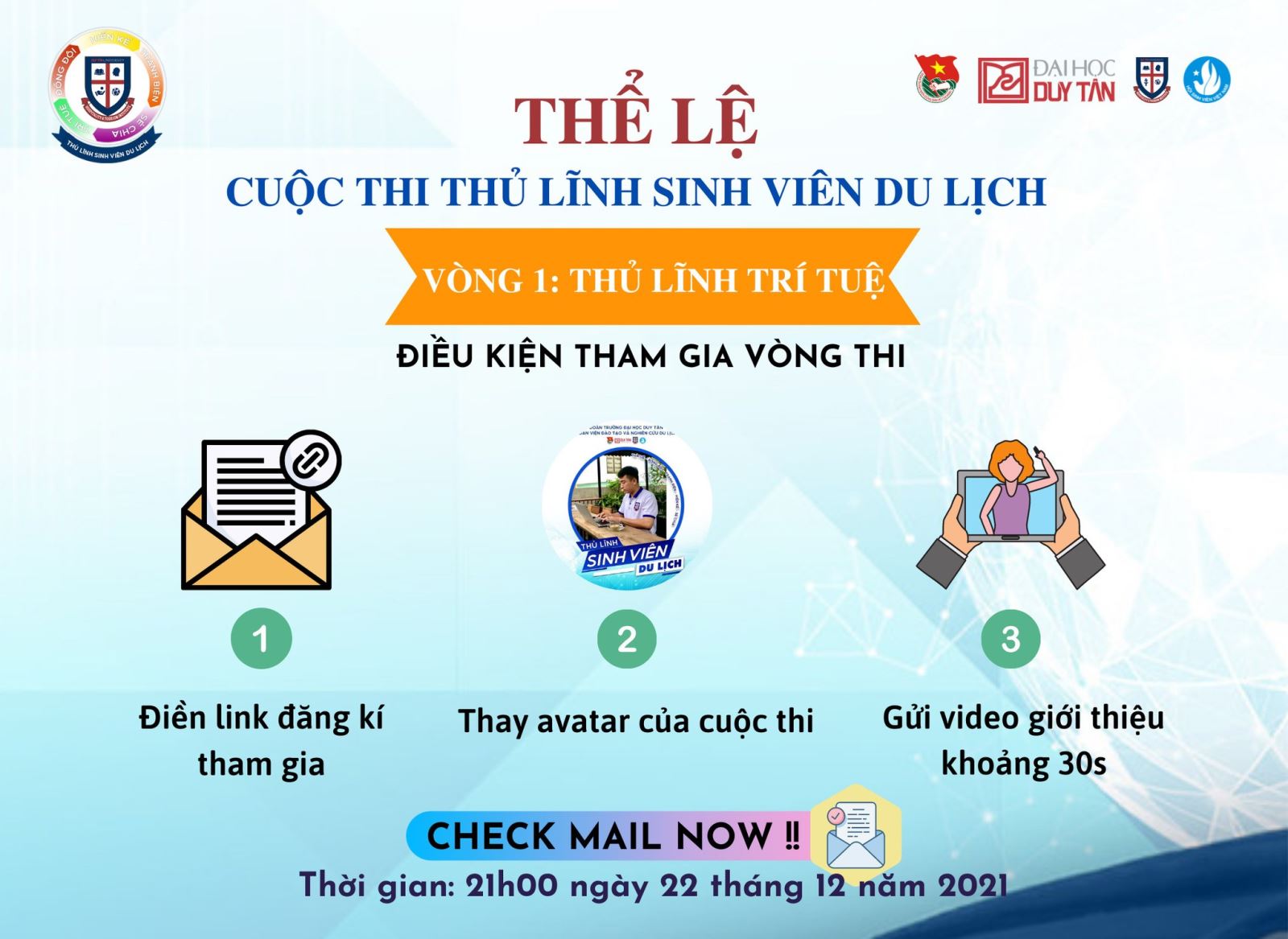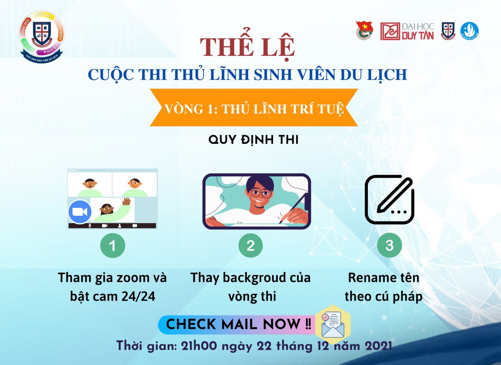 - Tất cả thí sinh tham gia Zoom theo link - ID - Pass đã được BTC gửi mail trong thời gian từ 21h00 - 21h15 Ngày 22/12/2021.