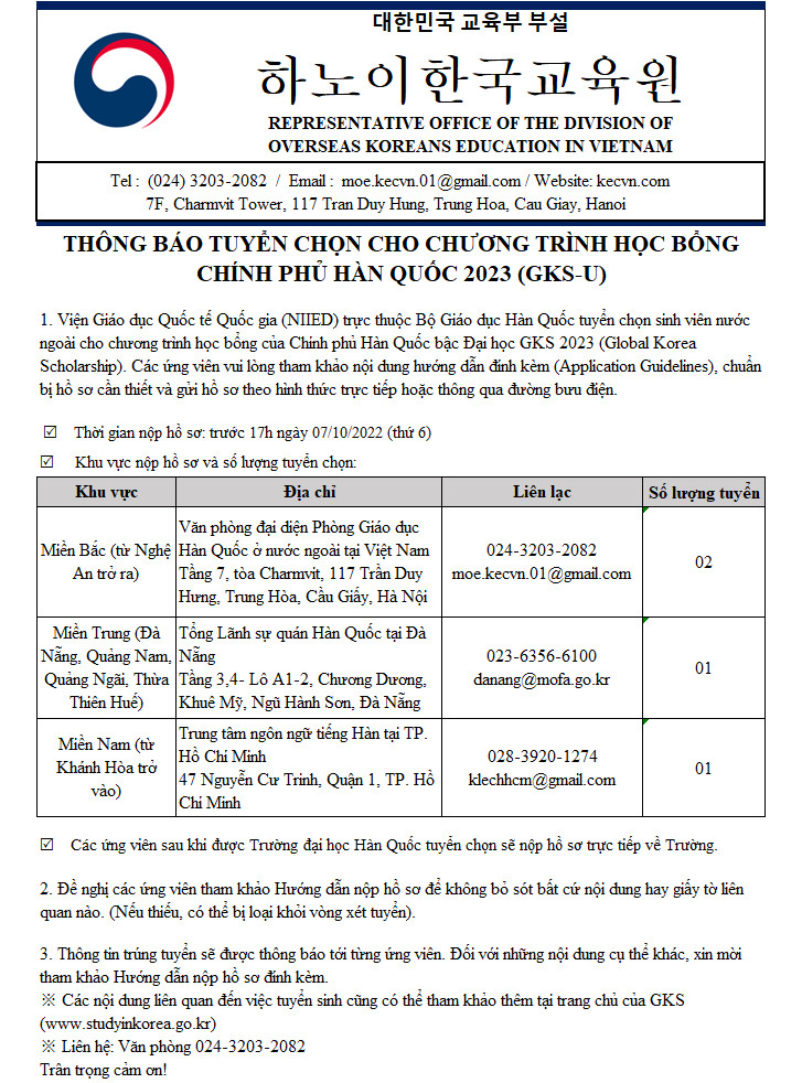 Các nội dung liên quan đến việc tuyển sinh cũng có thể tham khảo thêm tại trang chủ của GKS (www.studyinkorea.go.kr) hoặc trang web của Văn phòng: kecvn.com