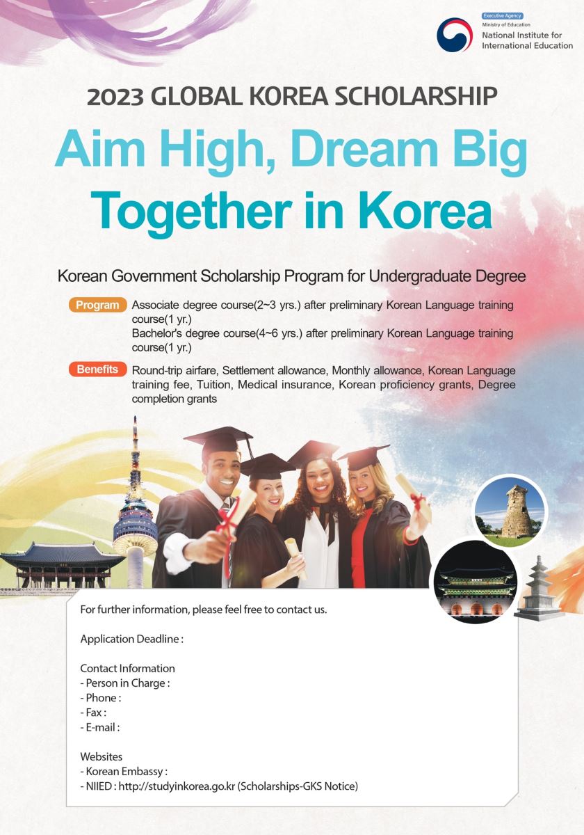 Viện Giáo dục Quốc tế Quốc gia (NIIED) trực thuộc Bộ Giáo dục Hàn Quốc tuyển chọn sinh viên nước ngoài cho chương trình học bổng của Chính phủ Hàn Quốc bậc Đại học GKS 2023 (Global Korea Scholarship). Các ứng viên vui lòng tham khảo nội dung hướng dẫn (Application Guidelines), chuẩn bị các giấy tờ cần thiết và gửi hồ sơ bằng hình thức nộp trực tiếp hoặc thông qua đường bưu điện.