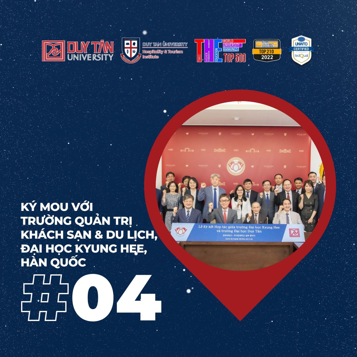 Ký MOU với Trường Quản trị Khách sạn & Du lịch, Đại học Kyung Hee tại Hàn Quốc - là Học Viện đào tạo du lịch & khách sạn danh giá nhất trong hệ thống các Trường Đại học tại Hàn Quốc và thuộc Top 50 trên thế giới.