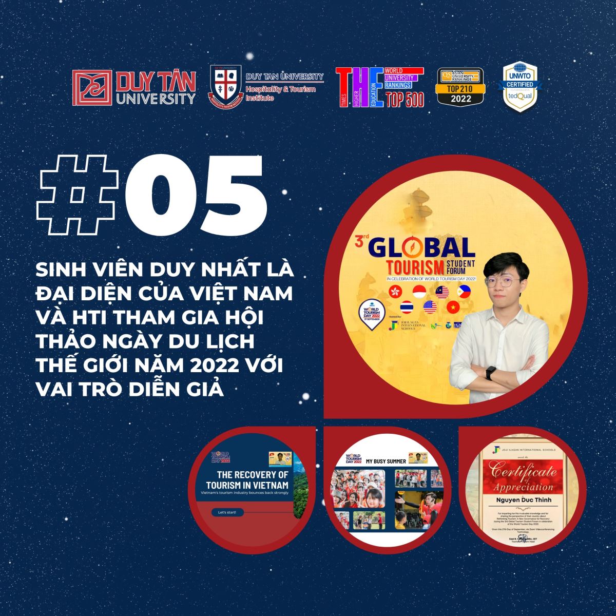 Bạn Nguyễn Đức Thịnh - sinh viên duy nhất của Việt Nam và HTi là Đại diện và Diễn giả chia sẻ trong Hội thảo Ngày Du lịch Thế giới năm 2022 và nhận được nhiều phản hồi tích cực từ bạn bè quốc tế.