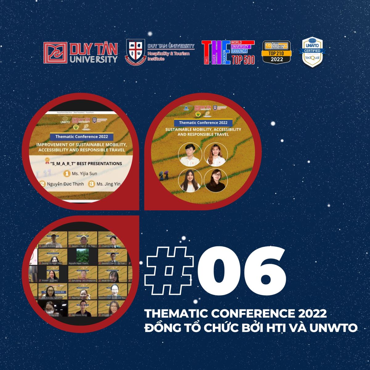Trường Du lịch, Đại học Duy Tân và Tổ chức Du lịch Thế giới (UNWTO) đồng tổ chức thành công Hội thảo Quốc tế (Thematic Conference 2022). Trong đó, nhóm nghiên cứu của HTi đã dành được giải trình bày xuất sắc nhất, nhóm nghiên cứu bao gồm: Nguyễn Đức Thịnh, Võ Mai Tuyết Nhi, Huỳnh Thị A Ly, Trần Thị Tú Nhi.