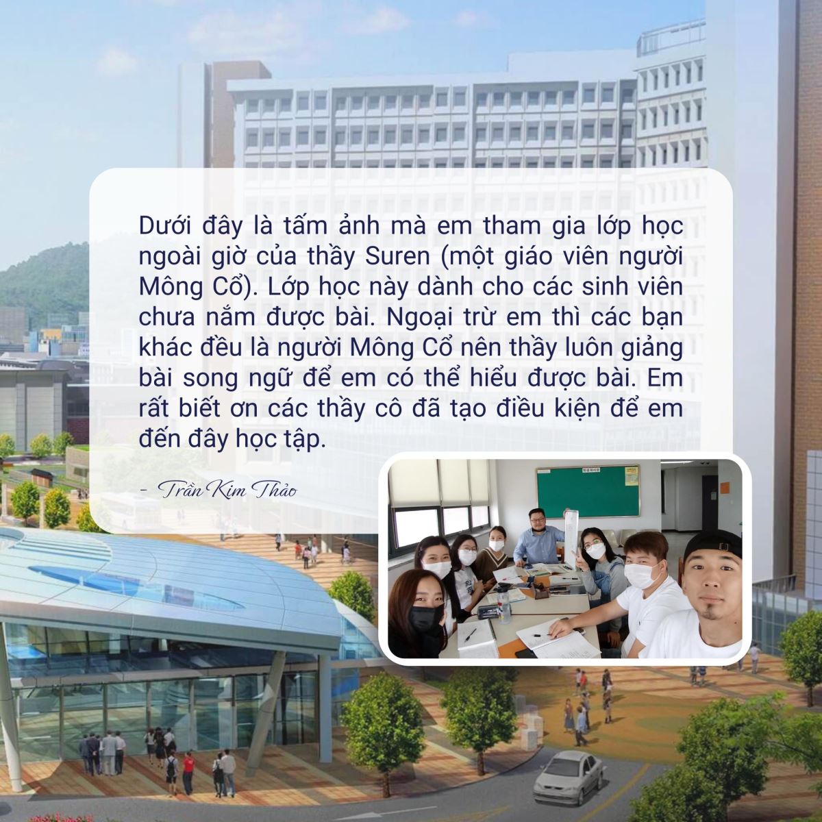 Đến sinh sống tại một đất nước xa lạ, bạn Kim Thảo chia sẻ: “Em đã đến Hàn Quốc được hơn 1 tháng và đã ổn định được cuộc sống. Lúc mới sang thì mọi việc khá khó khăn với em, em không thể bắt kịp được nhịp sống ở đây vì em không biết tiếng Hàn và lại còn đi một mình. Nhưng sau đó em cảm thấy bản thân rất may mắn vì nhận được nhiều sự giúp đỡ từ cô Hường và các anh chị người Việt Nam đang sinh sống ở đây. Ngoài ra, vì em chỉ biết tiếng Anh nên các giảng viên ở trường đều rất nỗ lực để giúp em hiểu bài điển hình là các giáo viên người Mông Cổ. Dưới đây là tấm ảnh mà em tham gia lớp học ngoài giờ của thầy Suren (một giáo viên người Mông Cổ), lớp học này dành cho các sinh viên chưa nắm được bài. Ngoại trừ em thì các bạn khác đều là người Mông Cổ nên thầy luôn giảng bài song ngữ để em có thể hiểu được bài. Em rất biết ơn các thầy cô đã tạo điều kiện để em đến đây học tập.”