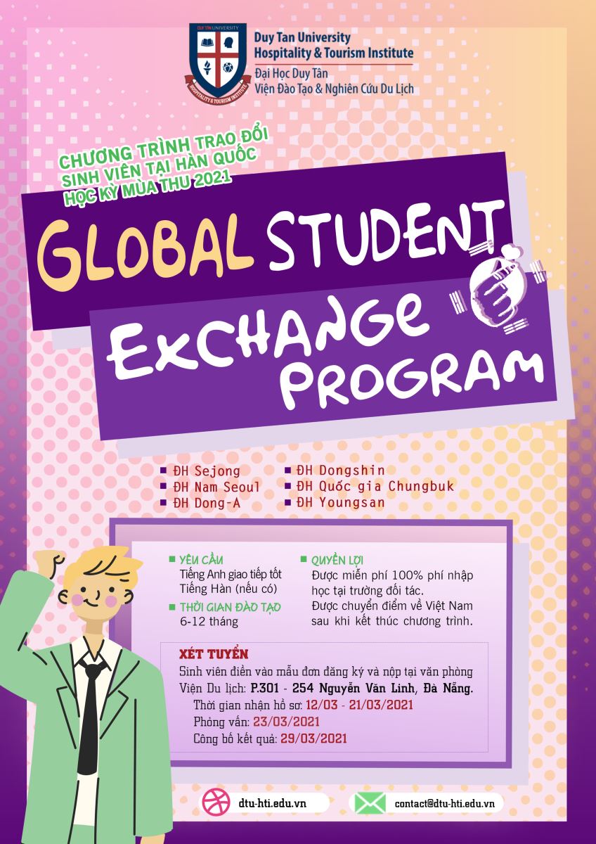 Chương trình trao đổi sinh viên toàn cầu do Viện Đào tạo và Nghiên cứu du lịch (HTi) tổ chức hàng năm vào 2 đợt tháng 3 và tháng 9. Các đối tác chính của chương trình là 07 trường đại học của Hàn Quốc, 02 trường tại Đài Loan, 01 trường tại Thái Lan và 01 trường tại Macao. Đây không chỉ là cơ hội để sinh viên Duy Tân được giao lưu, trao đổi và bồi dưỡng kiến thức, kỹ năng chuyên môn ở vùng đất mới mà còn là dịp để các bạn sinh viên nâng cao trình độ ngoại ngữ, tự tin khám phá văn hóa - con người tại nước bạn.
