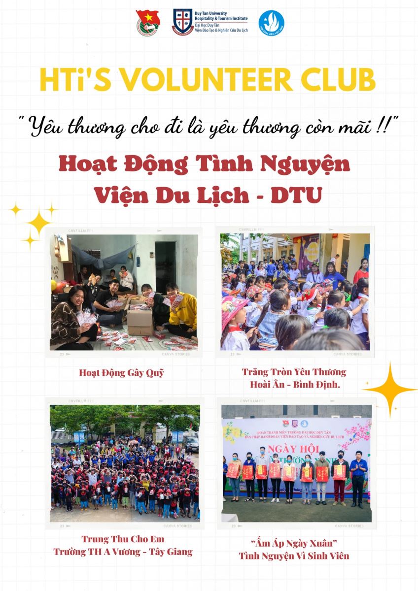 Nhằm xây dựng một môi trường để sinh viên của trường ĐH Duy Tân nói chung và viện Đào tạo & Nghiên cứu Du Lịch nói riêng được tham gia các hoạt động thiện nguyện. HTi’s Volunteer Club đã được tạo dựng - là nơi để các bạn lan toả sự yêu thương đến với mọi người, cùng nhau làm nên những việc có ích giúp cho xã hội tốt đẹp hơn.