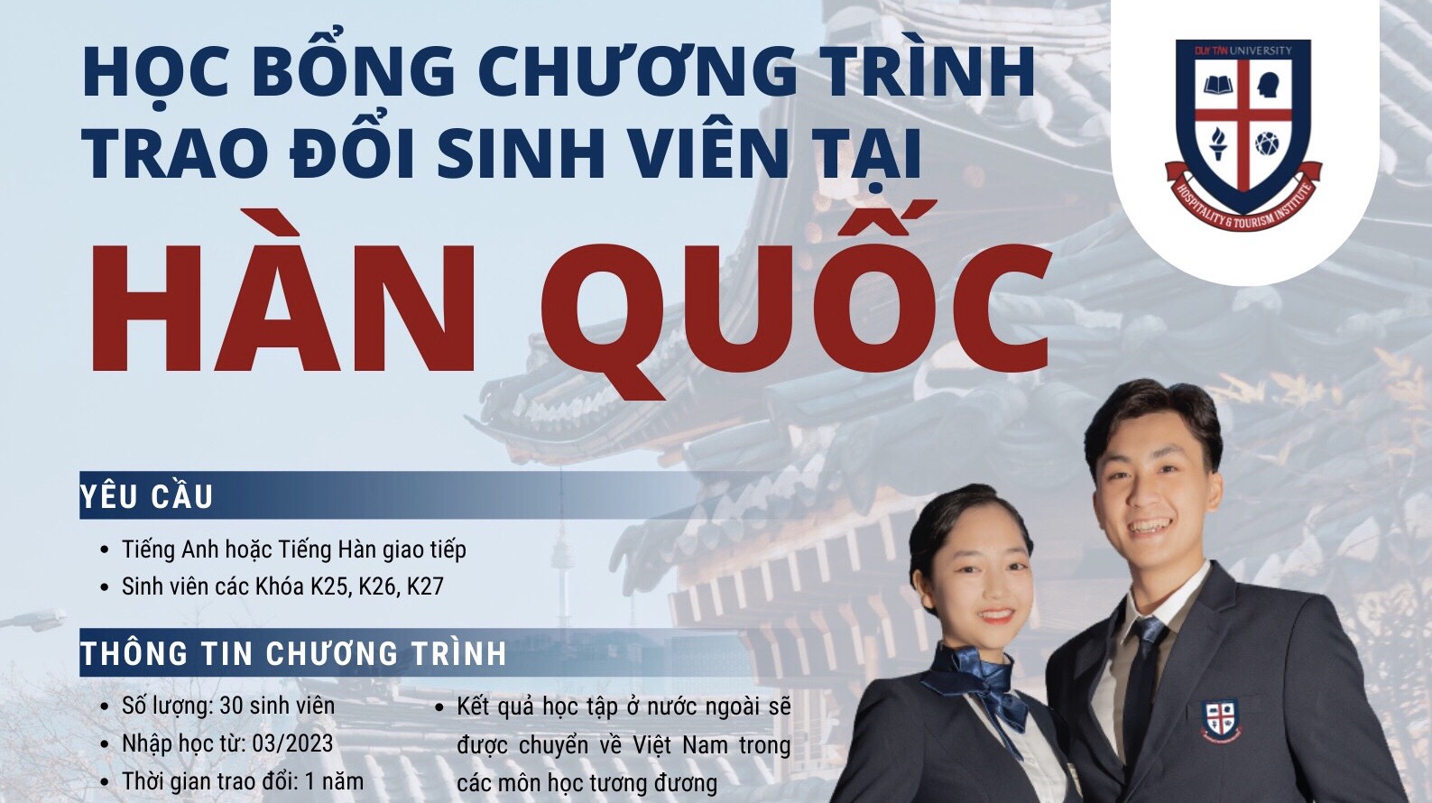 Trường Du lịch thông báo chương trình học bổng trao đổi sinh viên tại Hàn Quốc học kỳ mùa xuân 2023 như sau: ✅ Đối tượng: sinh viên khoá K25, K26, K27 ✅ Số lượng: 30 suất ...