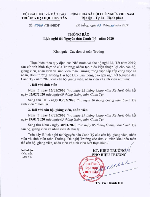 Thông báo lịch nghỉ tết Nguyên Đán Canh Tý năm 2020FILE