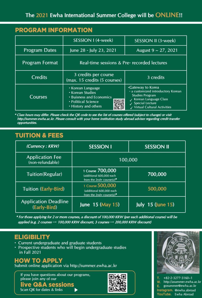 Ewha Womans University in Seoul, Korea are excited to announce that the 2021 Ewha International Summer College (EISC) will be all ONLINE! We hope that many international students interested in learning more about Korea will join us virtually this summer. The EISC will be offering various Korean Language courses in addition to courses from various fields, including in Business, Economics, History, and others. There are also some cultural experiences such as live session on K-pop dance ready for all participants.2021 Ewha Online International Co-Ed Summer College