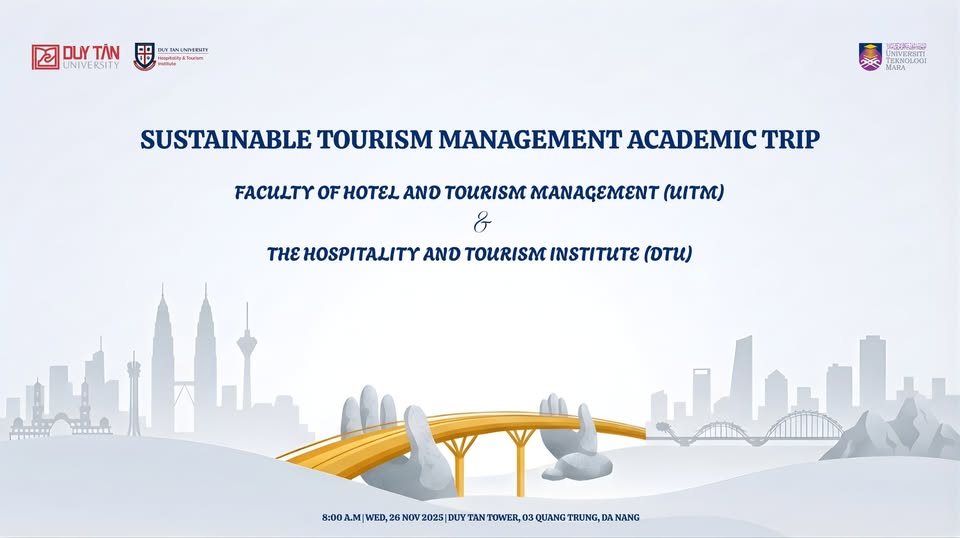 Nhằm thực hiện định hướng Go Global và mở rộng cơ hội học thuật quốc tế cho sinh viên, Trường Du lịch – Đại học Duy Tân phối hợp với Khoa Quản lý Khách sạn và Du lịch – Đại học Công nghệ MARA (Malaysia) tổ chức chương trình Học thuật về Quản lý Du lịch Bền vững. Chương trình mang đến cơ hội để sinh viên trao đổi kiến thức, học hỏi kinh nghiệm và tiếp cận những góc nhìn quốc tế về du lịch bền vững. Thông qua hoạt động này, sinh viên được khuyến khích mở rộng tầm nhìn, phát triển kỹ năng toàn cầu và chuẩn bị sẵn sàng cho các cơ hội nghề nghiệp trong ngành du lịch – dịch vụ tại Việt Nam cũng như trên trường quốc tế.